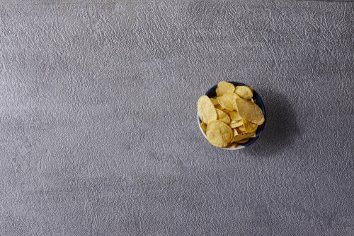 وجبات خفيفة متنوعة في أوعية فخارية على خلفية رمادية