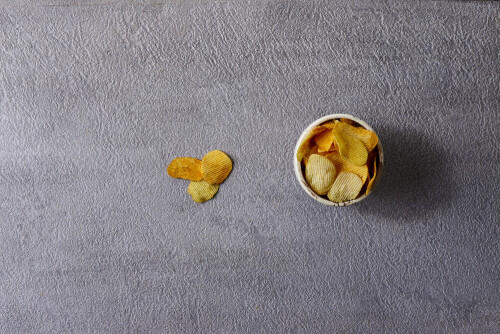 وجبات خفيفة متنوعة في أوعية فخارية على خلفية رمادية