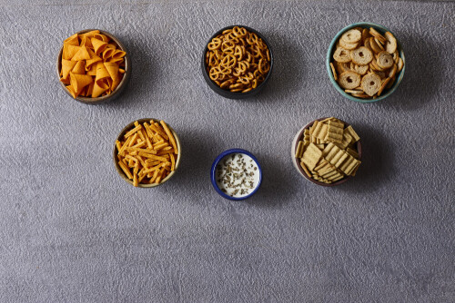 وجبات خفيفة متنوعة في أوعية فخارية على خلفية رمادية