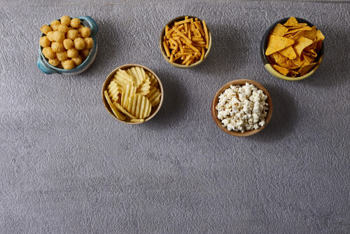 وجبات خفيفة متنوعة في أوعية فخارية على خلفية رمادية