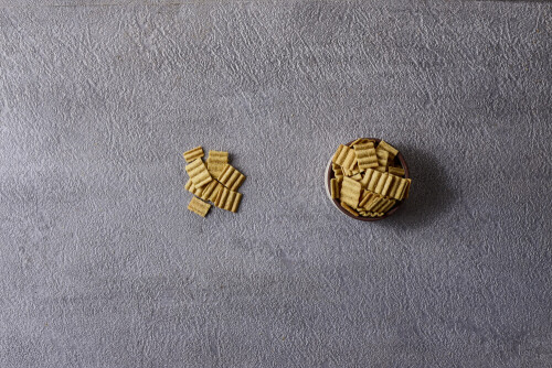وجبات خفيفة متنوعة في أوعية فخارية على خلفية رمادية