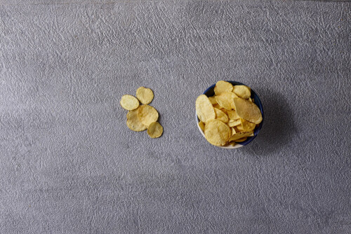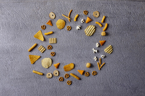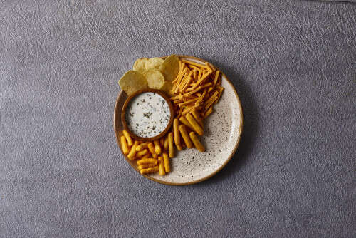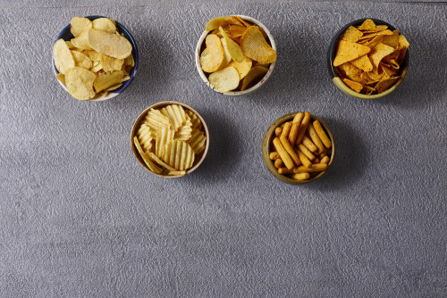 وجبات خفيفة متنوعة في أوعية فخارية على خلفية رمادية