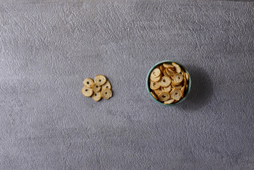 وجبات خفيفة متنوعة في أوعية فخارية على خلفية رمادية