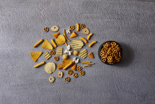وجبات خفيفة متنوعة في أوعية فخارية على خلفية رمادية