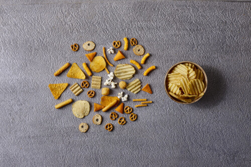 وجبات خفيفة متنوعة في أوعية فخارية على خلفية رمادية