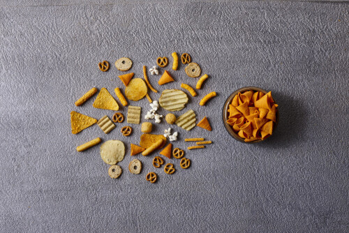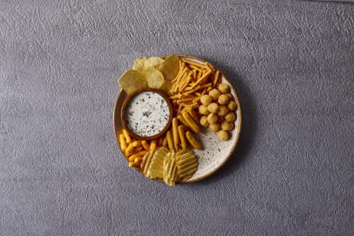 وجبات خفيفة متنوعة في أوعية فخارية على خلفية رمادية