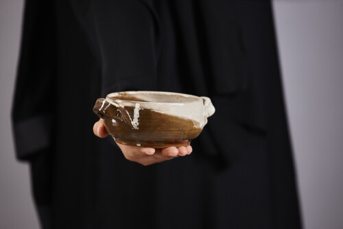 امرأة ترتدي عباءة سوداء تحمل أدوات فخارية مختلفة في أوضاع متعددة