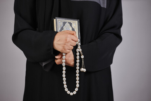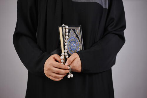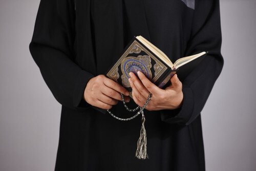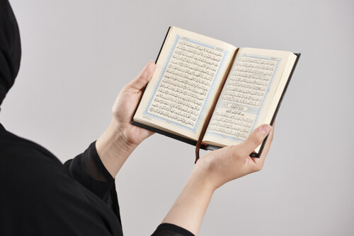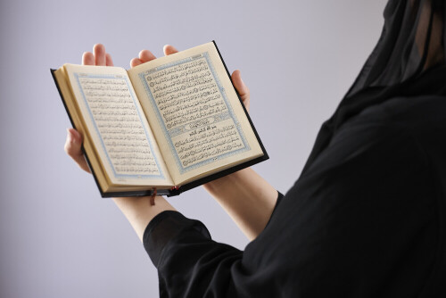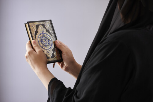 امرأة تحمل بيديها مصحف القرآن في أوضاع متعددة