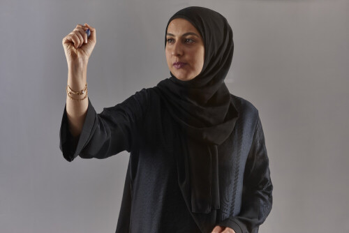 Woman in abaya writing on transparent board