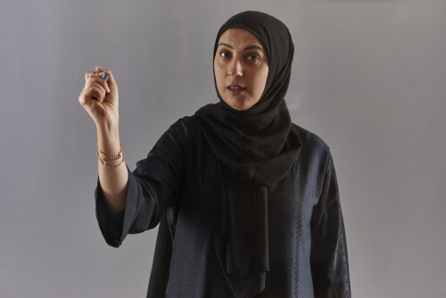 Woman in abaya writing on transparent board