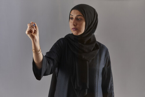 Woman in abaya writing on transparent board
