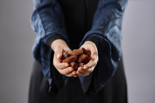 Woman in abaya holding dates in different positions