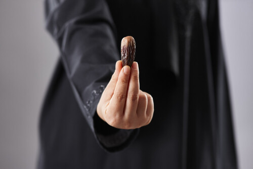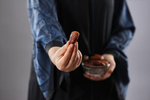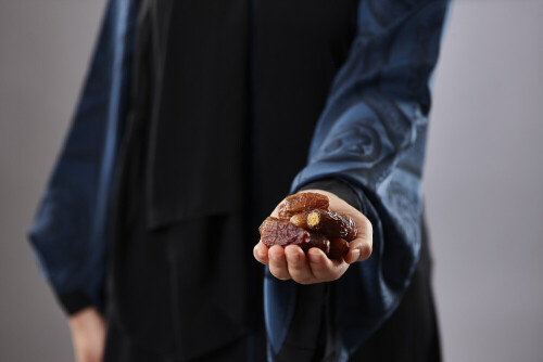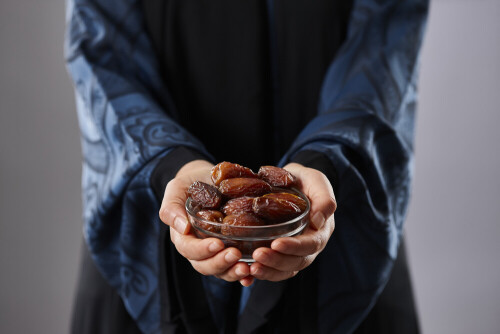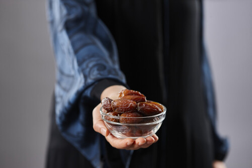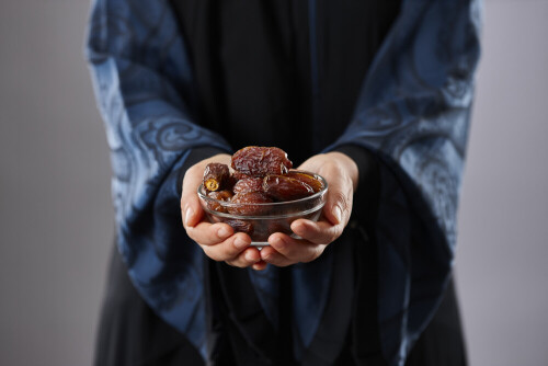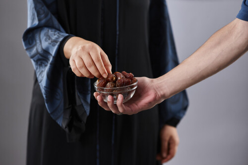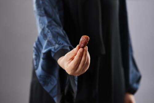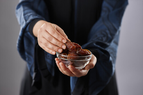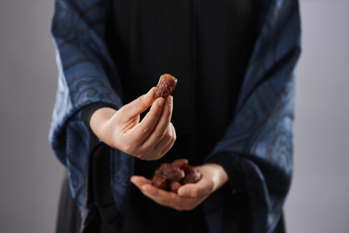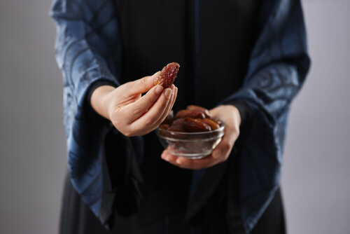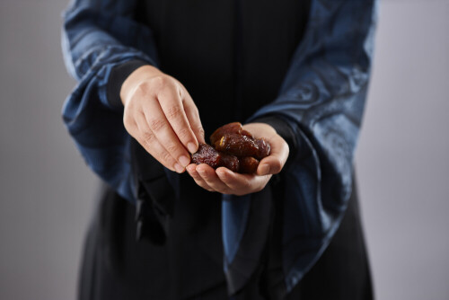 Woman in abaya holding dates in different positions