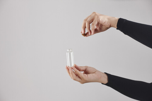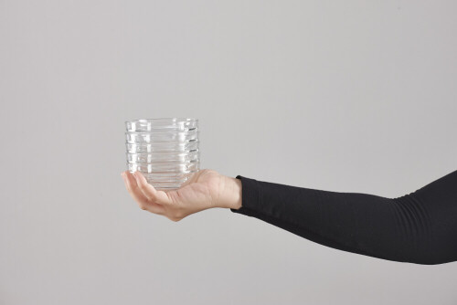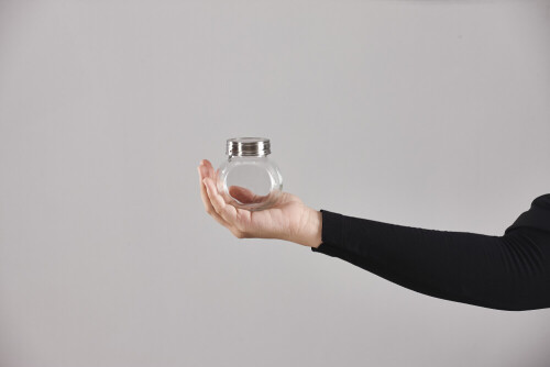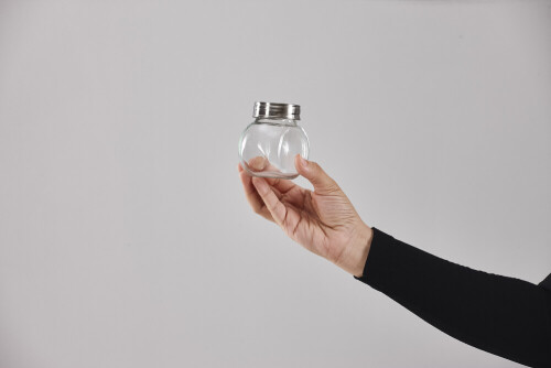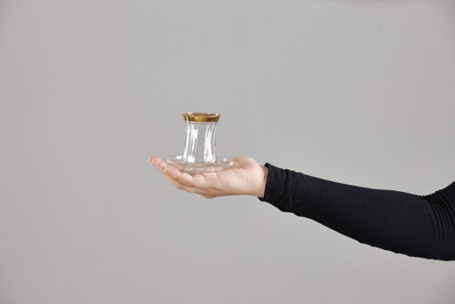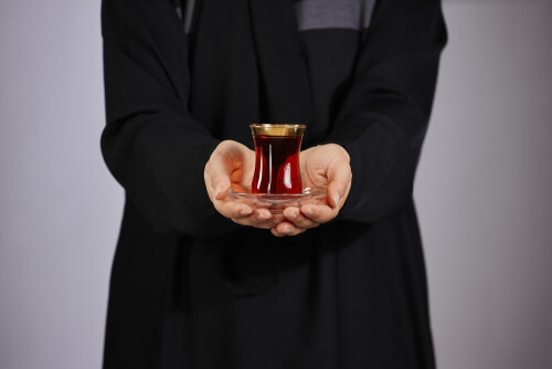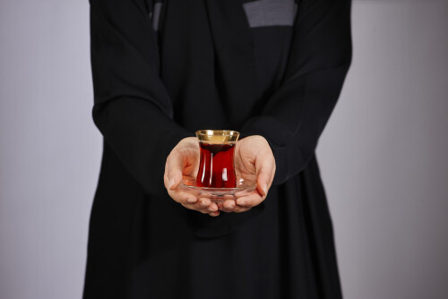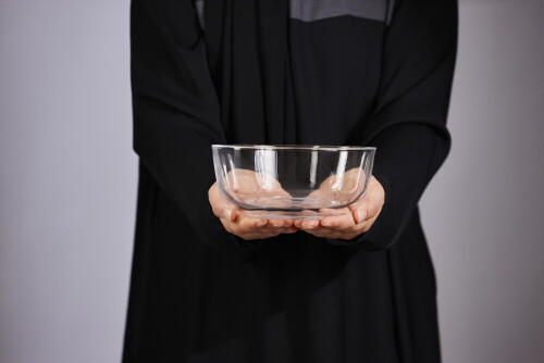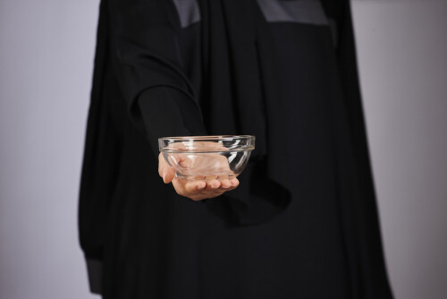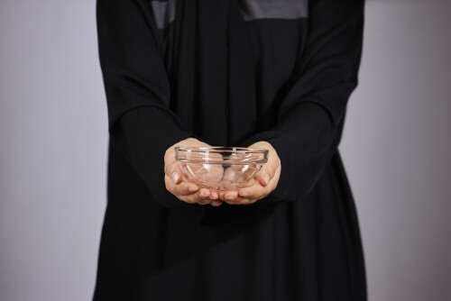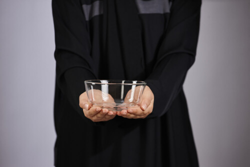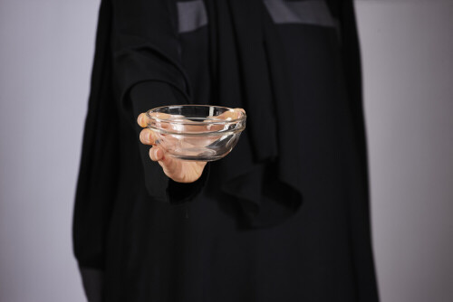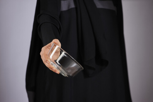 A woman in black abaya holding different glassware in different positions