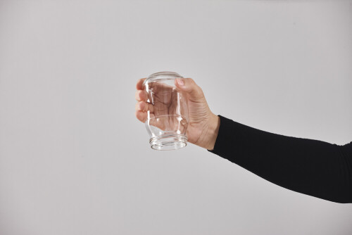 A woman in black abaya holding different glassware in different positions