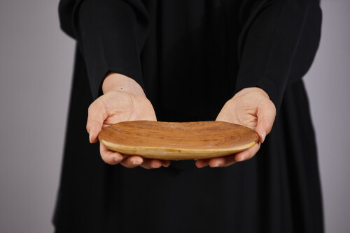 A woman in black abaya holding different wooden essentials in different positions