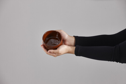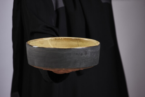 A woman in black abaya holding different pottery essentials in different positions