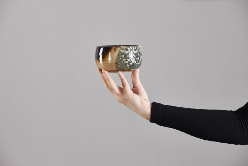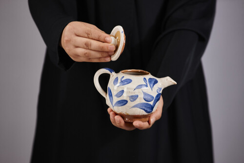 A woman in black abaya holding different pottery essentials in different positions