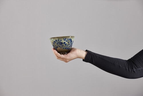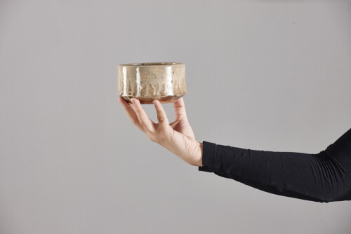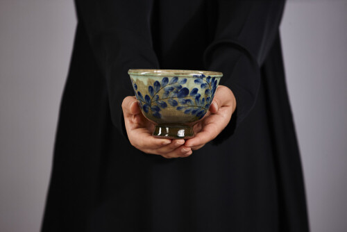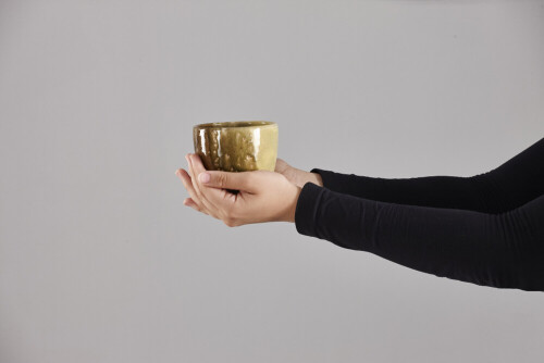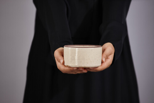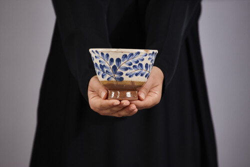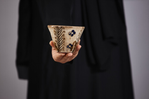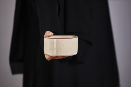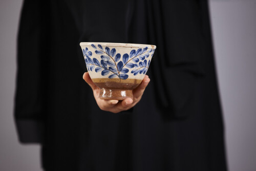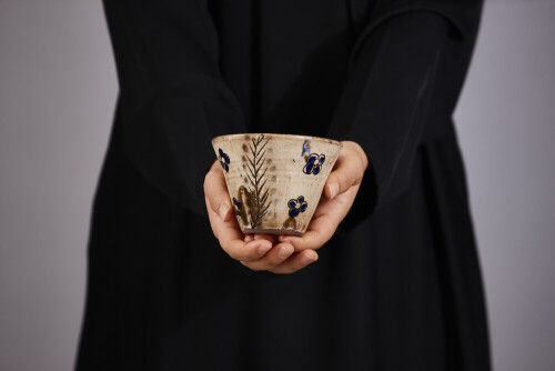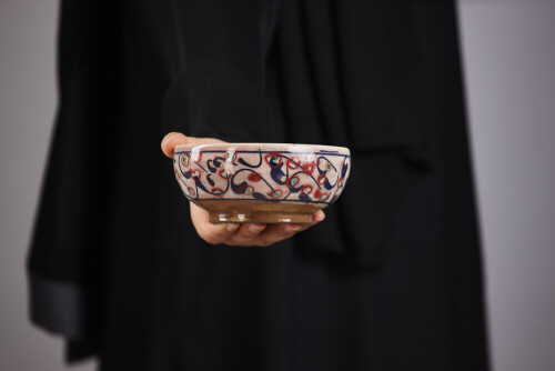 A woman in black abaya holding different pottery essentials in different positions