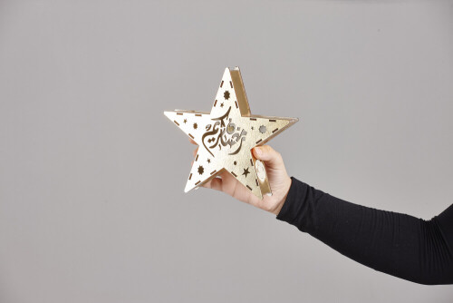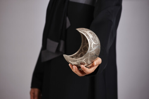 A woman in black abaya holding different ramadan lanterns in different positions