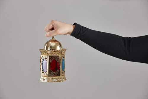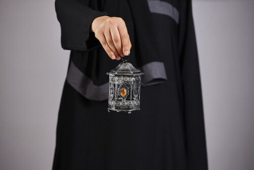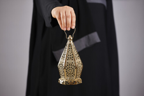 A woman in black abaya holding different ramadan lanterns in different positions