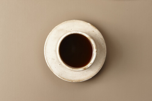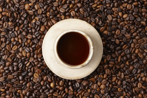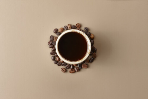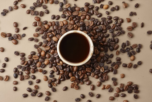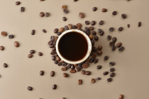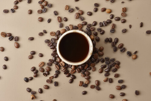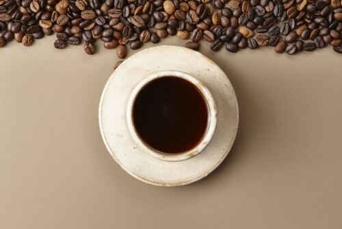 A beige pottery cup of coffee surrounded by roasted coffee beans on beige background