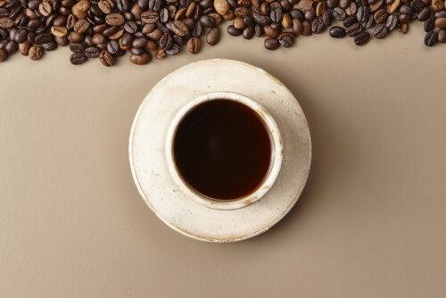 A beige pottery cup of coffee surrounded by roasted coffee beans on beige background