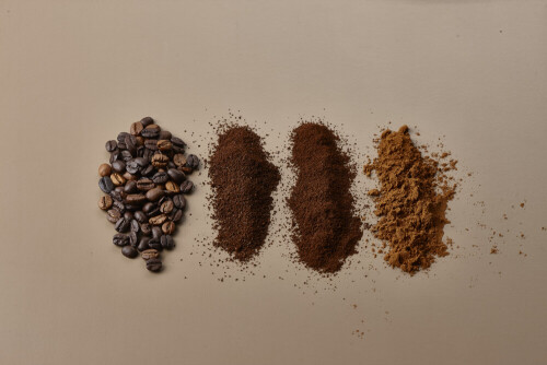 Assorted kinds of coffee such as roasted beans and ground on beige background