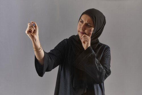 Woman in black abaya and hijab holding a marker pen to write on a transparent board with different reactions and expressions on grey background